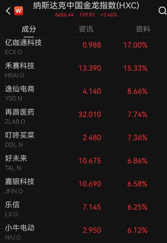 中概股方面,纳斯达克中国金龙指数涨超2%,热门个股中,阿里巴巴、小鹏汽车涨超3%。