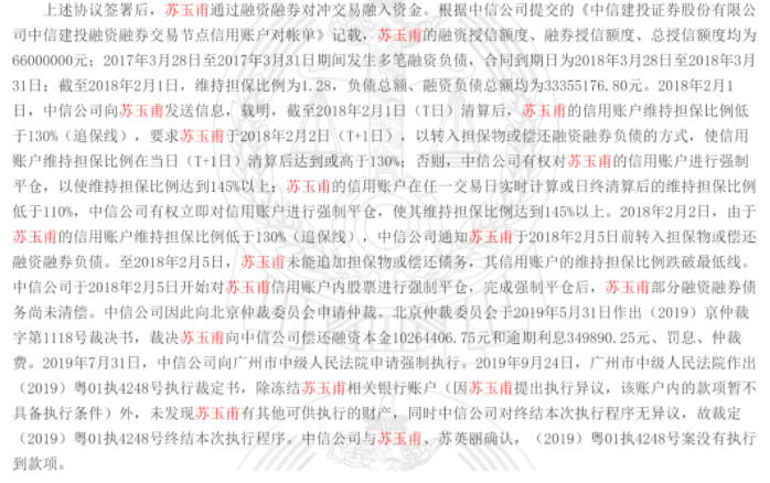 每经AI快讯,近期,中国裁判文书网披露的一则判决书显示,广州一名69岁老太加杠杆炒股,中信建投证券居然能给其授信6600万元的两融额度。根据裁判文书显示,老人名叫苏玉甫,1953年生人,在广州独居。截至2018年2月1日, 苏玉甫已经使用了3335.5万元的融资额度,但当天其账户的维持担保比例跌至128%。直到当年2月5日,苏玉甫仍未能追加担保物或偿还债务,维持担保比例最终跌破110%,中信建投随即对苏玉甫信用账户内股票进行强制平仓,强平后,苏玉甫部分融资融券债务尚未清偿。根据北京仲裁委员会于2019年5月31日作出的裁决, 苏玉甫仍需向中信建投偿还融资本金1026.4万元和逾期利息35万元。(中国基金报)