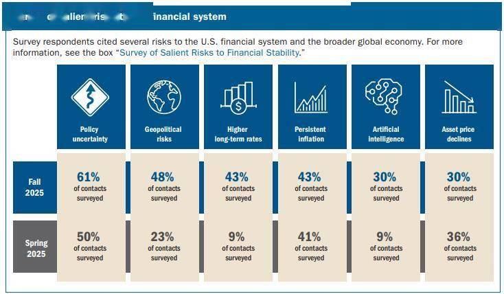 这份报告表明,市场面临的风险已从具体的贸易政策担忧转向更广泛的政策不确定性,同时人工智能(AI)相关资产的估值风险开始进入监管视野。
