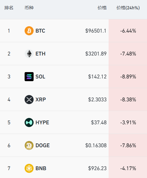 加密货币方面,主要币种大幅下挫。比特币暴跌超6%,报96501美元/枚。据CoinGlass数据显示,过去24小时内,全网超27万人被爆仓。