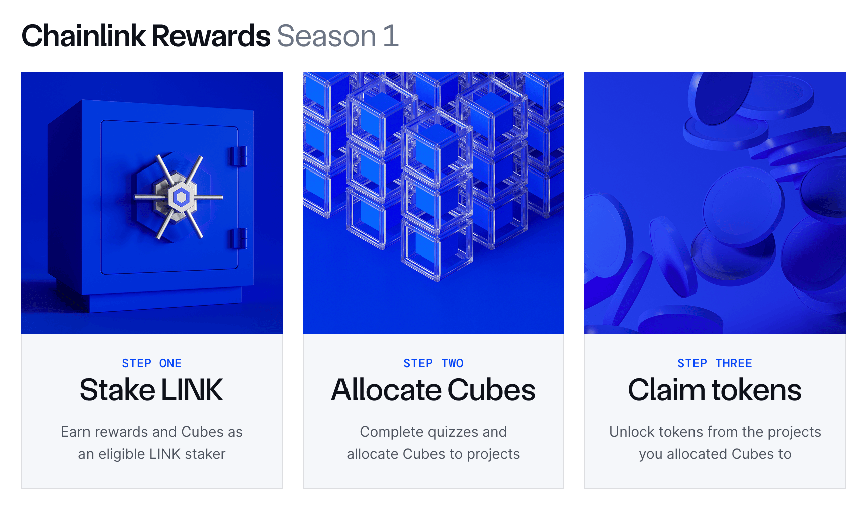 Cubes是一种不可转让、非货币化的计量单位,类似信用卡积分或航空里程,可用于兑换通证奖励。在Season 1中,符合条件的LINK质押者将根据其在Chainlink Staking v0.1与v0.2中的历史参与(质押数量与质押时长)获得相应Cubes。用于确定Season 1Cubes余额的快照已于