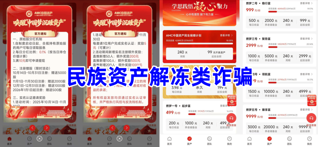 民族资产解冻诈骗。不法分子冒充“中国资产管理公司”的名义,制作散布涉诈APP,声明实名注册即可获得原始股,发展下线可获得现金奖励,虚构“AMC中国资产民生保障计划”“燃梦一号起步富”“起步富”“领航富”等理财项目。