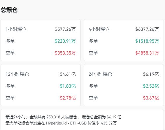 比特币一度再次失守10万美元整数关口。加密货币市场全网24小时,超25万人爆仓,6.19亿元(约合人民币44亿元)蒸发。