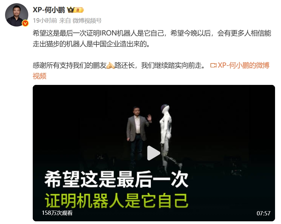 董事长何小鹏也在其社交媒体对“全新一代iron机器人是否内藏真人”进行回应:“总有人不相信这个世界变化如此快。”