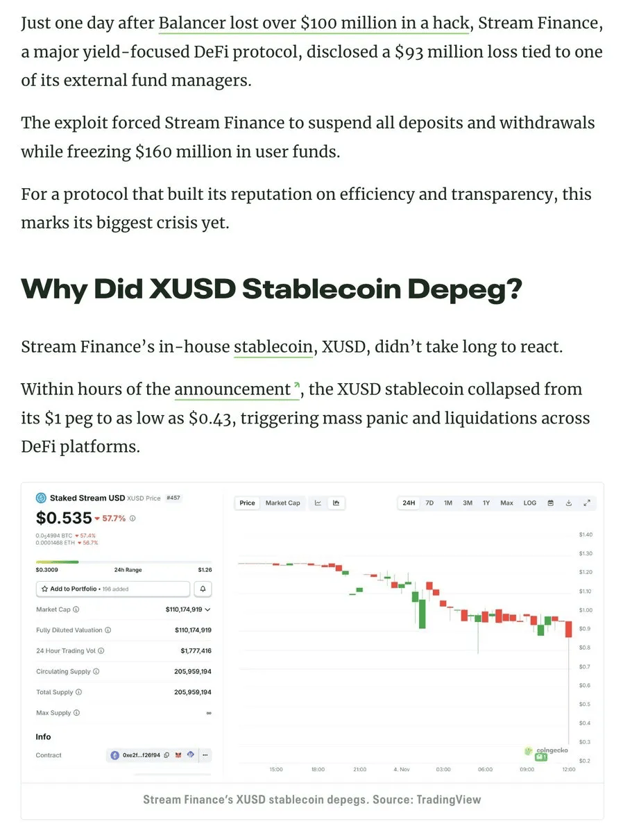 由于缺乏透明度、递归循环和专有策略,我们实际上不知道 Stream 用户的损失规模有多大。目前,Stream xUSD 稳定币价格为 0.15 美元。