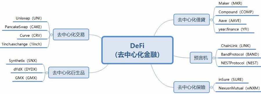 DeFi是一个比较大的区块链应用板块,可细分交易、借贷、衍生品、保险、预言机等,其中DeFi每个子板块都有许多不同的项目,而这些项目基本都有对应的代币,具体如下。