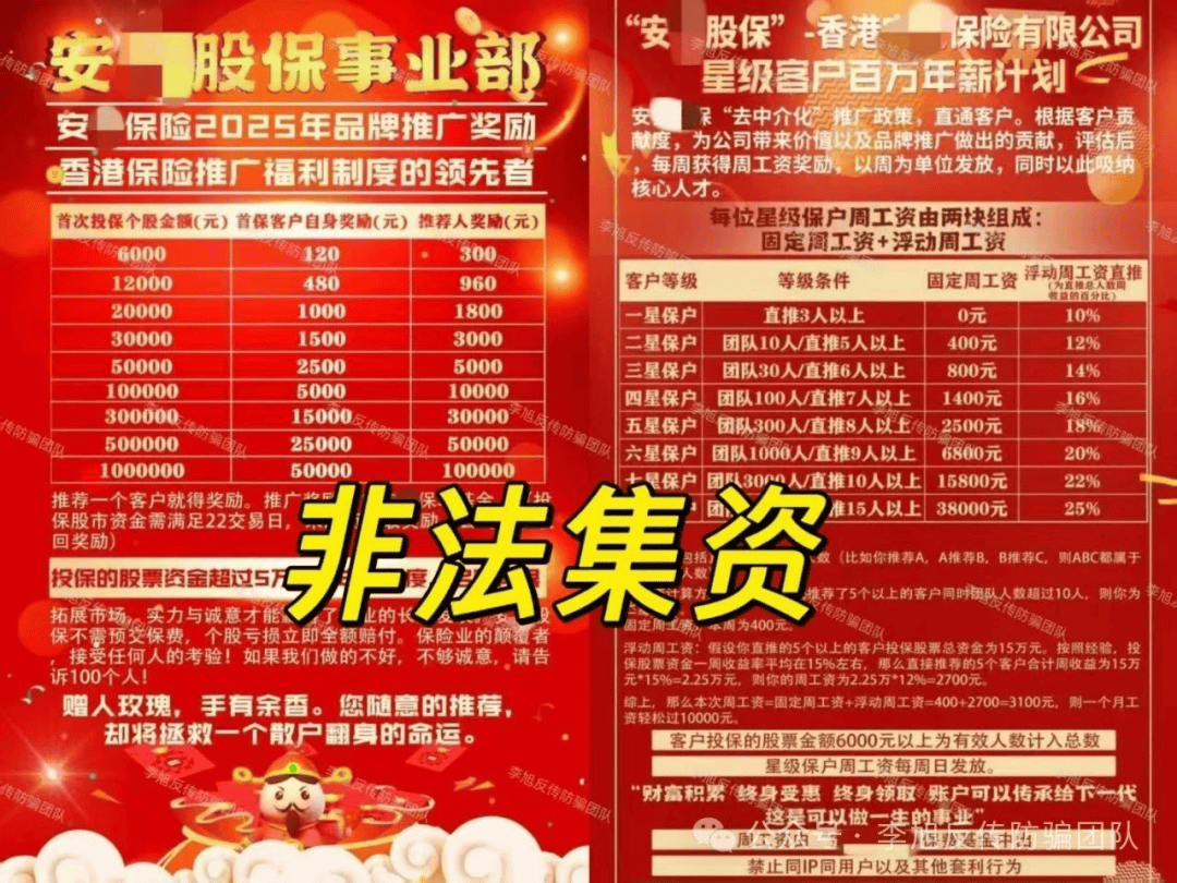 根据投保金额向参与者和推荐人发放奖励,根据推荐人数或团队人数设立8个星级,享周工资和最低10%浮动直推周工资。其模式符合传销特征,涉嫌非法集资。