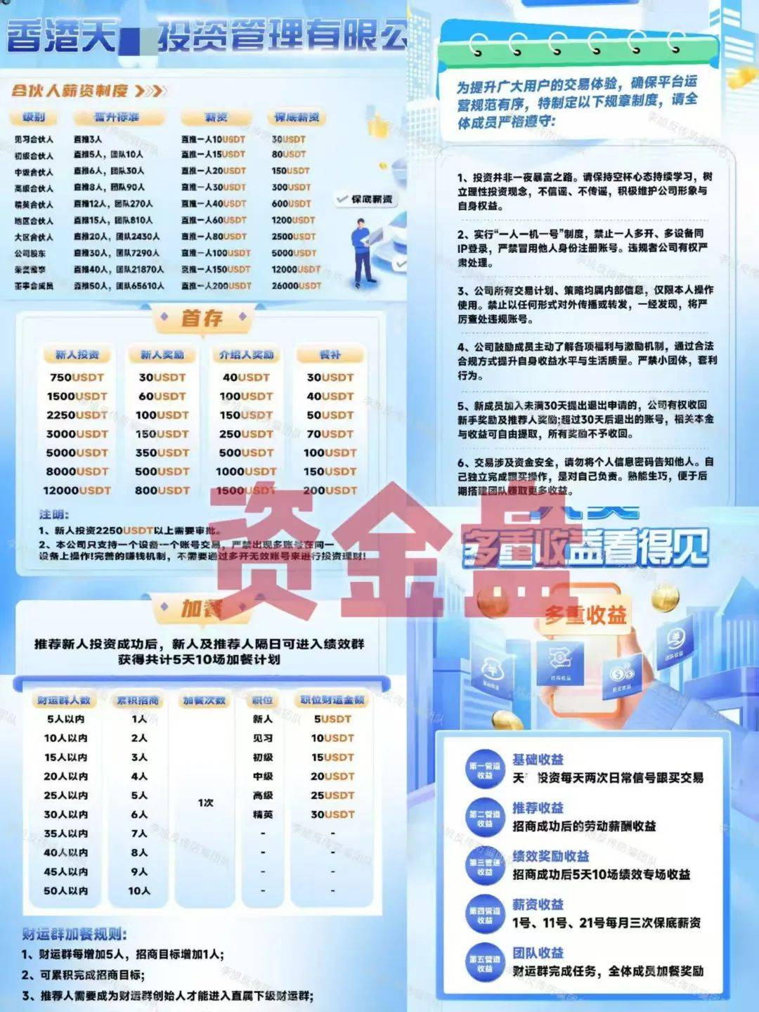 虚拟币跟投项目,参与者通过链上虚拟币充值进行每日两场的跟投交易。根据直推金额和团队人数划分10个等级发放“薪资”。完成群内拉新人数和招商人数作为个人等级晋升标准,获得“财运金”和“加餐”奖励。