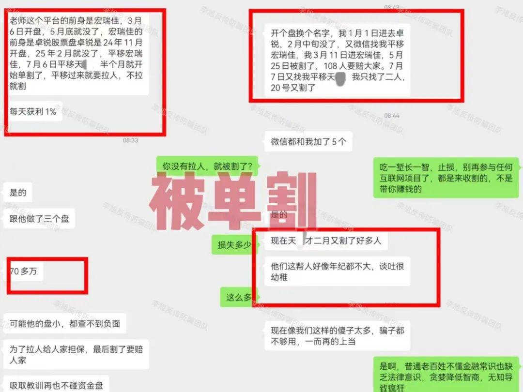 据参与者介绍,此项目为多次平移更换平台而来。24年底以“卓锐”的名字上线个月便,随后平移至“宏瑞佳”。运行半年后,于今年7月再次平移至此,但也仅仅运行了半个月便开始单割不积极纳新的参与者。网友先后跟随转移三个盘子,总计损失70万元。