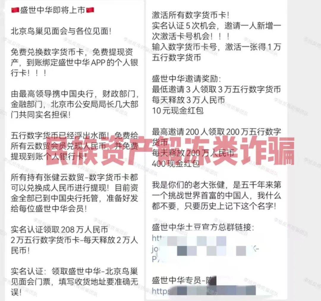 早在年初,公安部公布的78个民族资产解冻类诈骗项目及涉诈APP中,“盛世中华”就在名单当中。近日,有网友反馈,该项目在沉寂一段时间后,再次打着“张健”旗号,宣称实名注册即可领取208万人民币和2万五行数字货币卡。甚至“大言不惭”地表示即将在北京鸟巢与参与者见面。