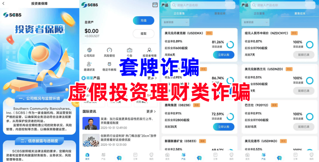 套牌诈骗。不法分子冒充境外“SCBS”银行的名义,制作散布涉诈APP,虚构推广“澳元兑加元”“惠陶集团”“新疆新鑫矿业”“纽元人民币中间价”“巴兰仕”等高额返利理财项目。