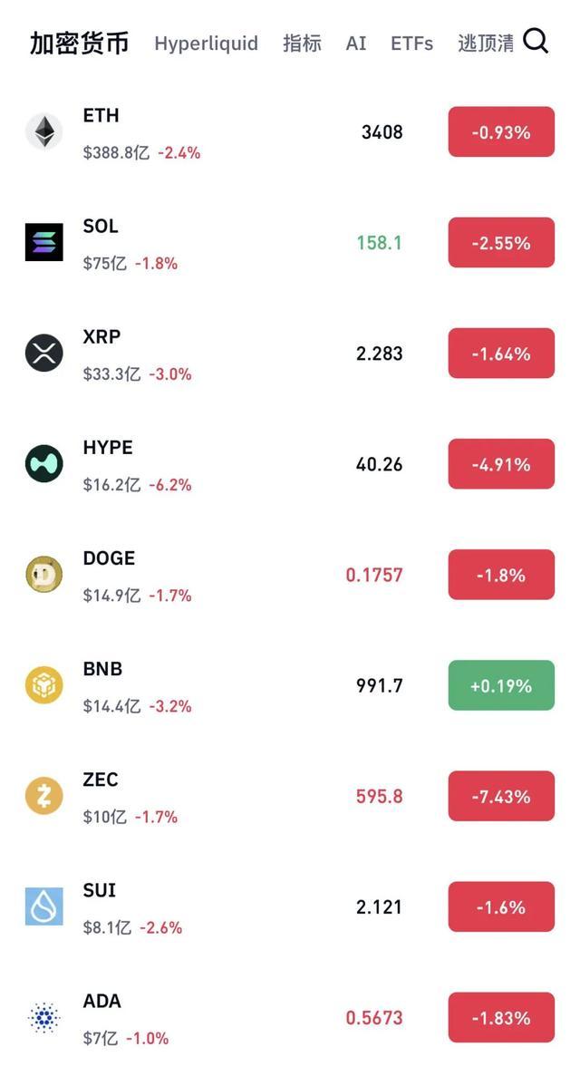 其他虚拟货币也经历了类似的波动。以太坊跌近1%,HYPE币跌近5%,狗狗币跌近2%。CoinGlass数据显示,过去24小时内,全球共有近14万人在加密货币交易中爆仓。