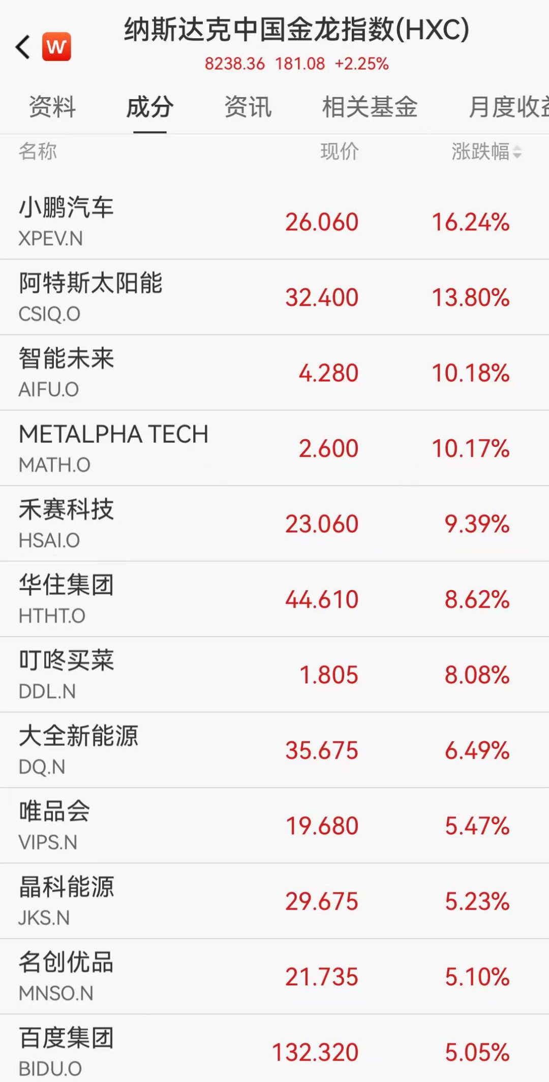 中概股普遍上涨,纳斯达克中国金龙指数涨2.25%。个股方面,小鹏汽车涨超16%,阿特斯太阳能涨近14%,禾赛科技涨超9%,华住集团涨近9%;蔚来跌超2%,京东集团跌逾1%,哔哩哔哩跌近1%。