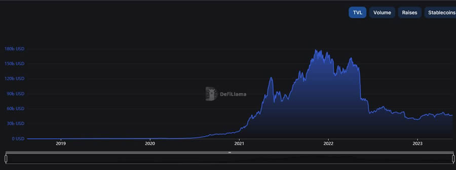 通过TVL走势图可看出,DeFi在2018年都不到1万美元,2019至2020年持续增长,2021初达到18亿美元并且开始加速增长,2022年TVL达到1800亿美元的峰值,仅仅一年时间涨幅10000%,爆发力非常强,这也是大家把2021称为DeFi元年的重要原因。