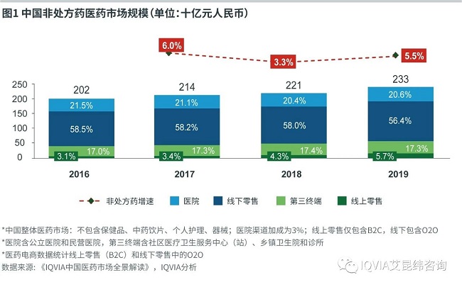 中国非处方药市场规模从2016年2018亿元成长到2019年2331亿元,占整体医药市场的15%,年复合增长率为5%。2019年医疗终端市场规模883亿元,零售终端市场规模1448亿元。零售终端为非处方药的主力市场,线下零售面临挑战,医药电商(含B2C和O2O)增速可观,而医疗终端受政策影响波动较大。
