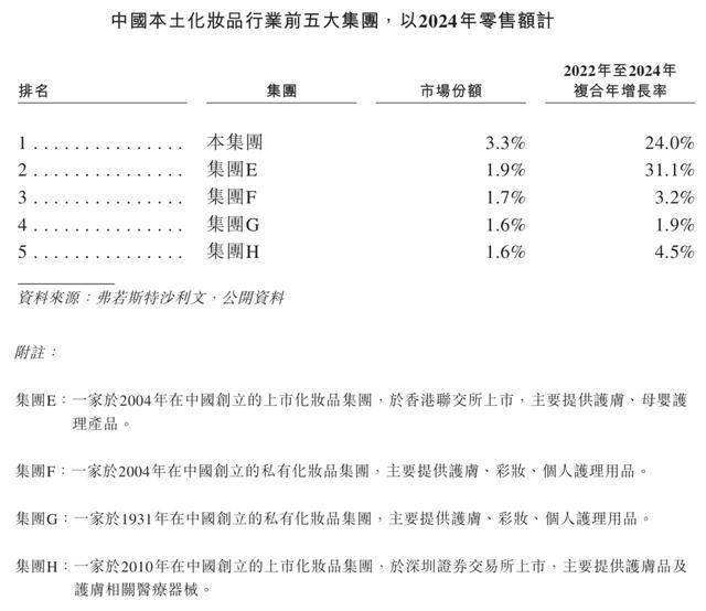 其中,珀莱雅是中国最大的本土化妆品集团,市场份额为3.3%,且自2021年起以零售额计,珀莱雅连续四年在中国本土化妆品行业保持此领先地位。
