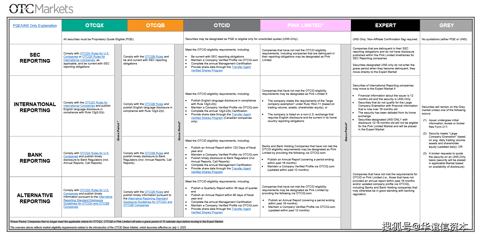 OTCID被定位为“信息披露基本市场”,介于OTCQB与Pink Limited Market之间,主要吸纳原OTC Pink中信息披露较规范的“Current”企业,同时设置更高合规门槛。这一层级划分有助于投资者根据公司的信息披露水平和风险特征进行区分。